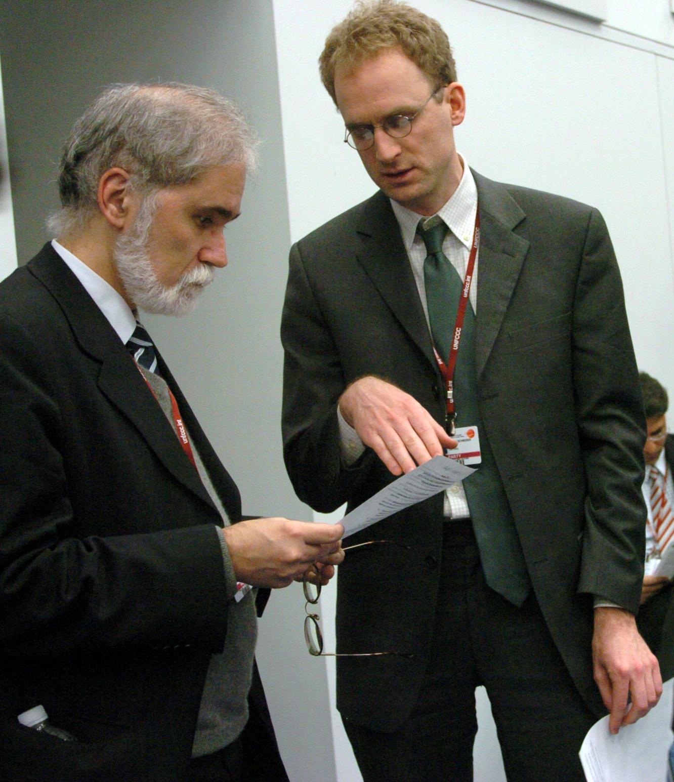 Two negotiators on CCS in the CDM, from Brazil and the European Union, discussing the text during COP11.